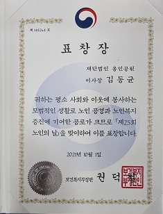 김동균 용인공원 이사장이 지난 1일 제 25회 노인의 날을 맞아 보건복지부 장관 표창을 수상했다고 20일 밝혔다.