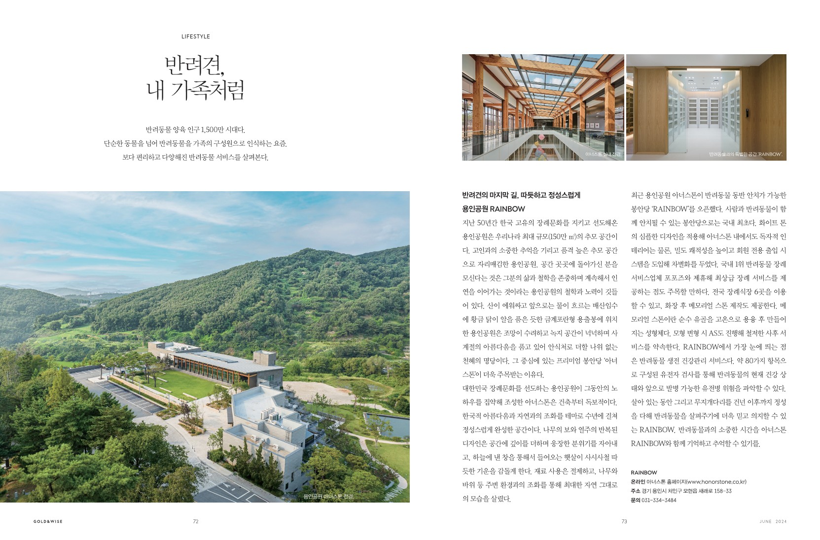 반려견의 마지막 길, 따듯하고 정성스럽게 용인공원 RAINBOW 지난 50년간 한국 고유의 장례문화를 지키고 선도해온 용인공원은 우리나라 최대 규모(150만 ㎡)의 추모 공간이다.