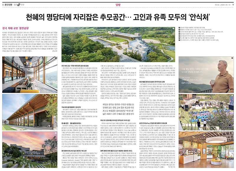 용인신문 | 재단법인 용인공원(이사장 김동균)은 전국 최대 규모인 150만㎡(50만여 평)의 면적에 50년 전통을 자랑하는 우리나라 장묘의 명가다. 또 고인을 가족처럼 정성껏 모시는 장묘 철학으로 3만여 가문과 20만여 명에 이르는 최다 회원을 보유하고 있으며 회원들의 자부심이 높다. 한국 고유의 장례문화 전통의 맥을 지키고 있는 용인공원은 매장묘, 봉안묘, 실내외 봉안당, 수목장, 평장묘 등 온고지신의 정신으로 전국 유일하게 실내외 모든 장법을 고르게 갖춰 우리나라 장묘 문화를 선도하는 대표적 추모공원으로 손꼽힌다.