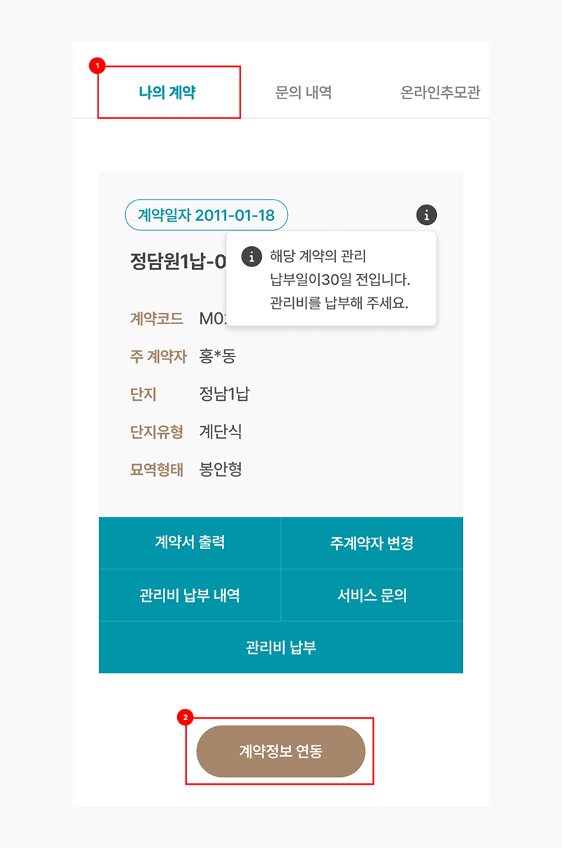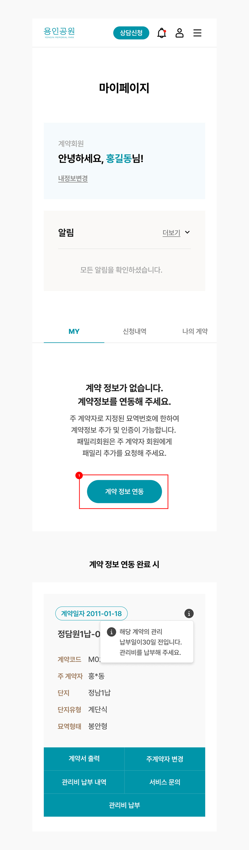 마이페이지 내의 계약 정보 연동 버튼을 선택해 주세요. 회원가입 정보(이름, 연락처)를 통해 주계약자로 지정된 묘역번호에 한하여 계약정보가 자동으로 연동됩니다.