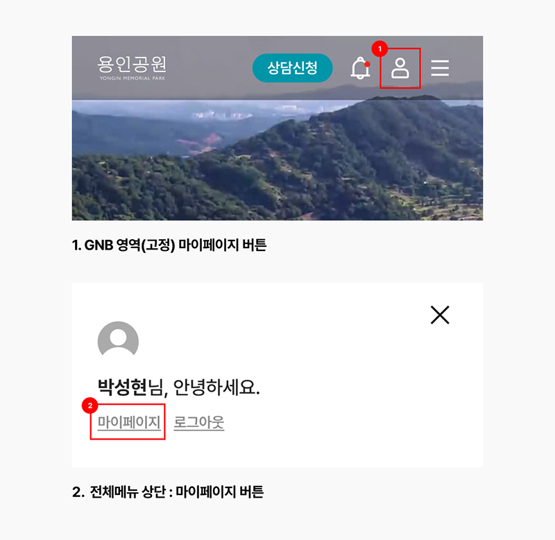 GNB 영역 마이페이지 버튼(①)과 전체메뉴 상단의 마이페이지 버튼(②)을 통해 이동하실 수 있습니다.