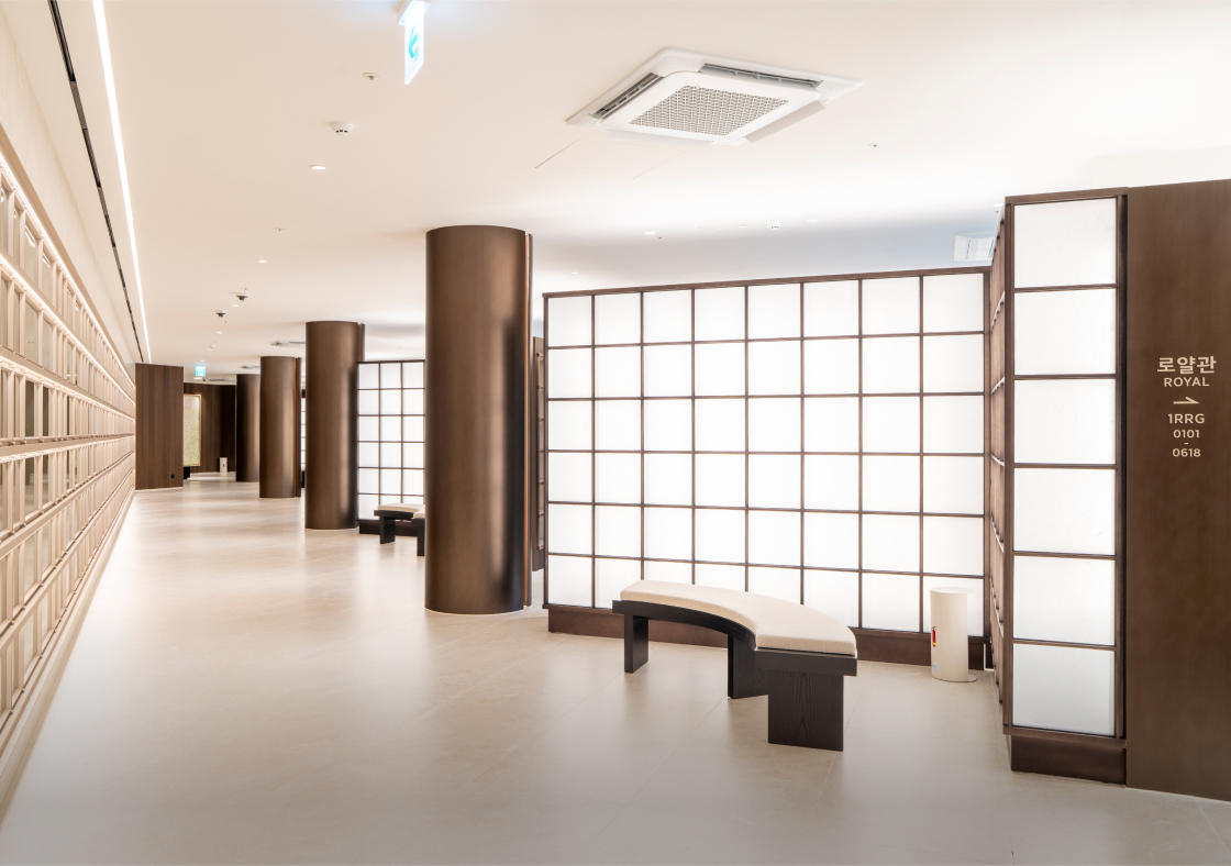 NOBLE, ROYAL 봉안실이 준비되어 있는 1층에는 아너스톤의 브랜드 철학과 지향점을 가장 직관적으로 보여주는 공간으로 ‘추모의 미학’과 ‘예술적 상징성’이 뚜렷하게 반영되어 있습니다.