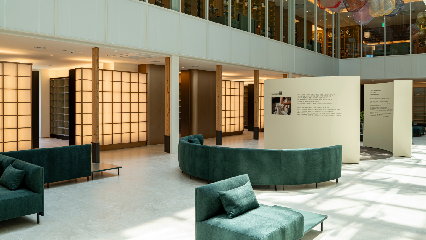 4층 천장에서 내려오는 자연 채광은 공간 깊숙이 스며들며