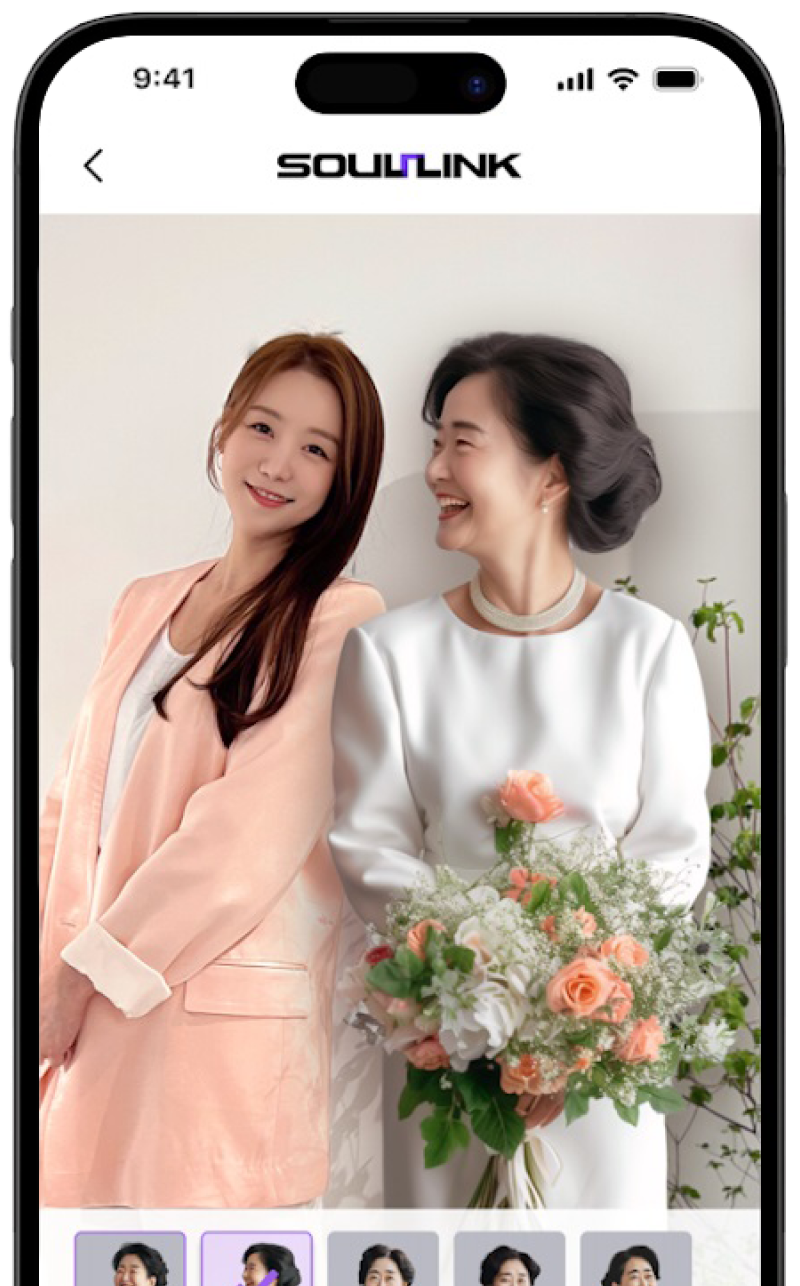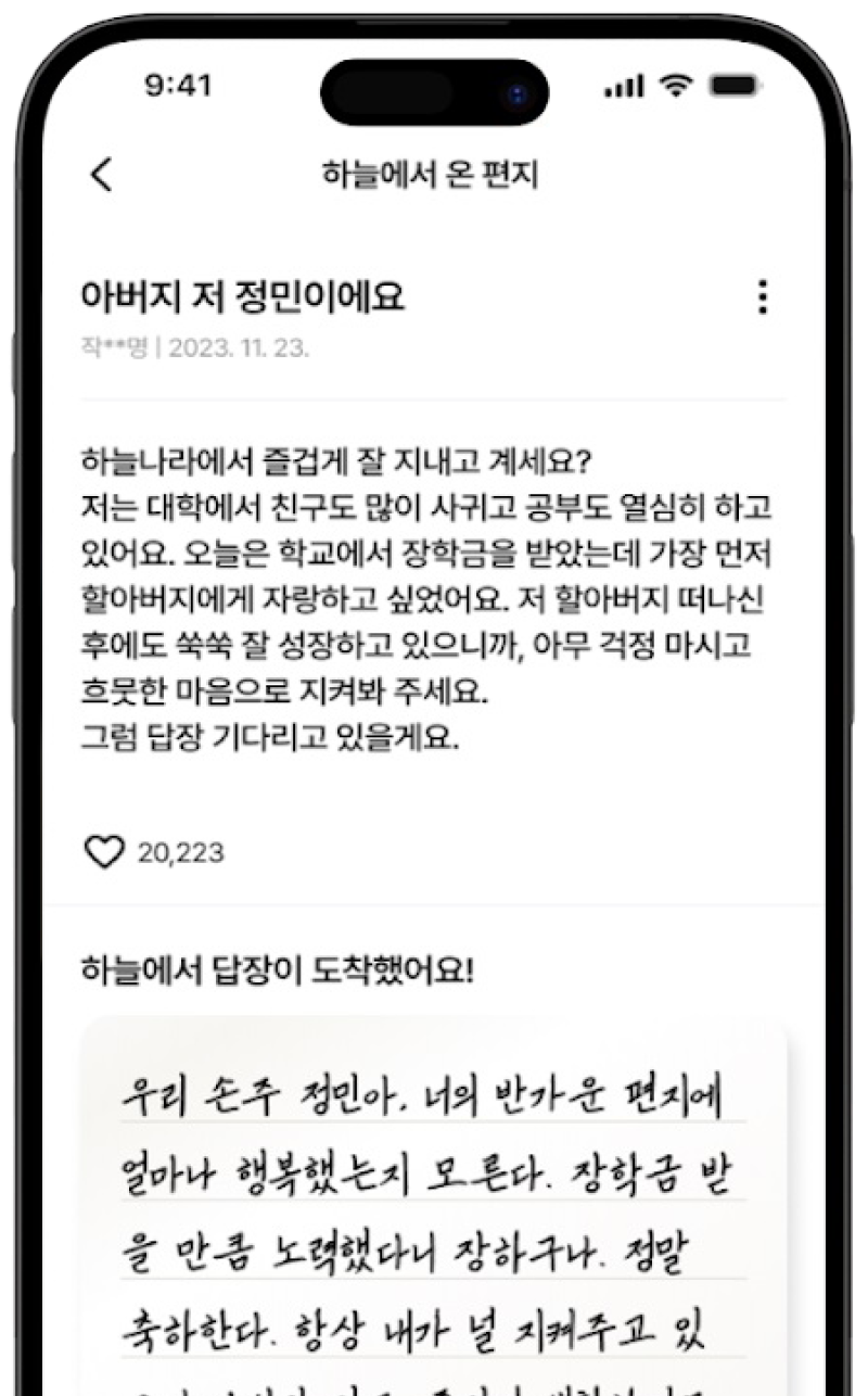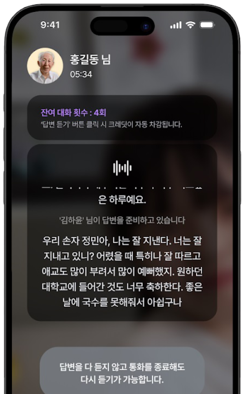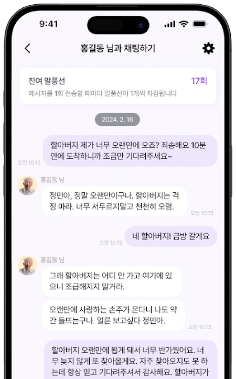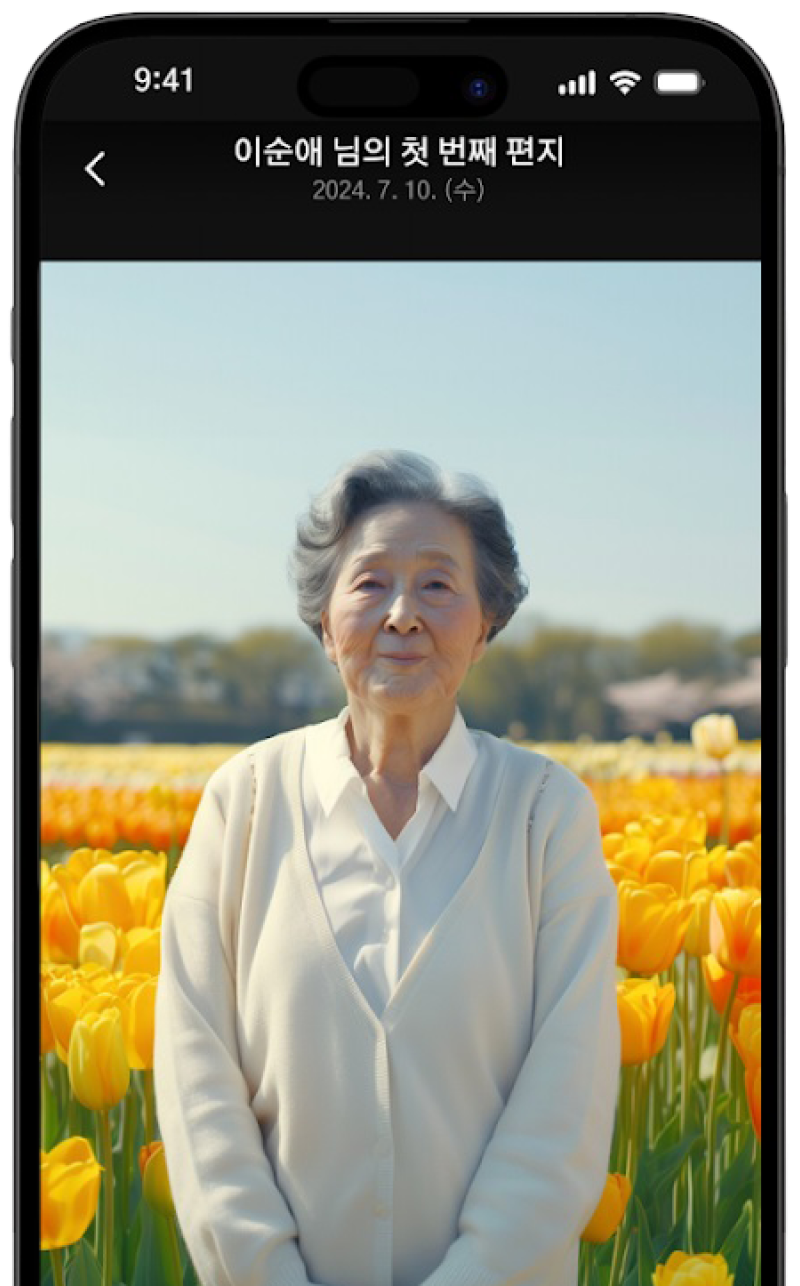 고인의 얼굴, 말투, 기억을 재현한 AI 디지털 트윈과 다양한 상호작용을 통해, 추억을 이어 나가며 상실의 슬픔을 치유할 수 있는 서비스입니다. 영상 편지, 실시간 채팅, 음성 대화, 함께 사진 촬영, 하늘에서 온 편지 등 5가지 주요 기능을 제공합니다.
