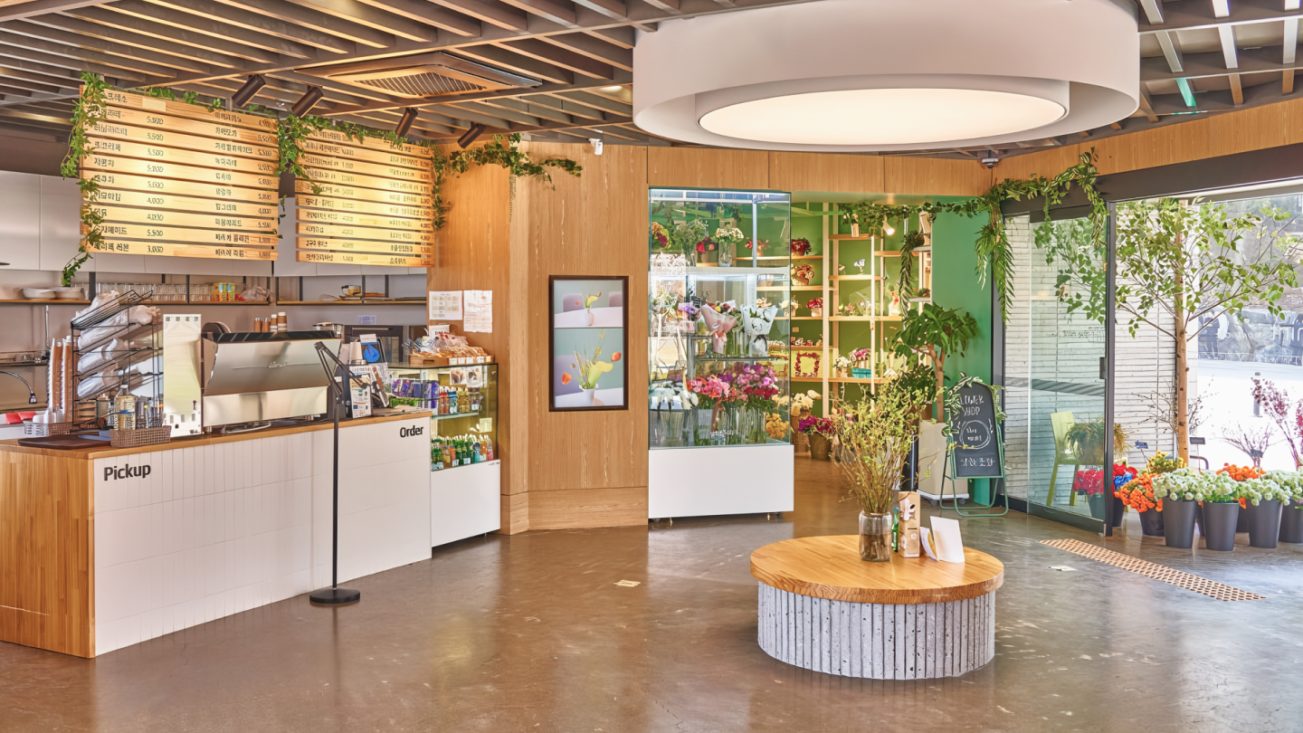 넓은 창 너머로 보이는 단아한 초록정원과 함께 꽃과 식물들이 가득한 공간입니다. 이곳에서의 차 한잔은 당신과 가족들에게 따뜻한 위로가 됩니다.